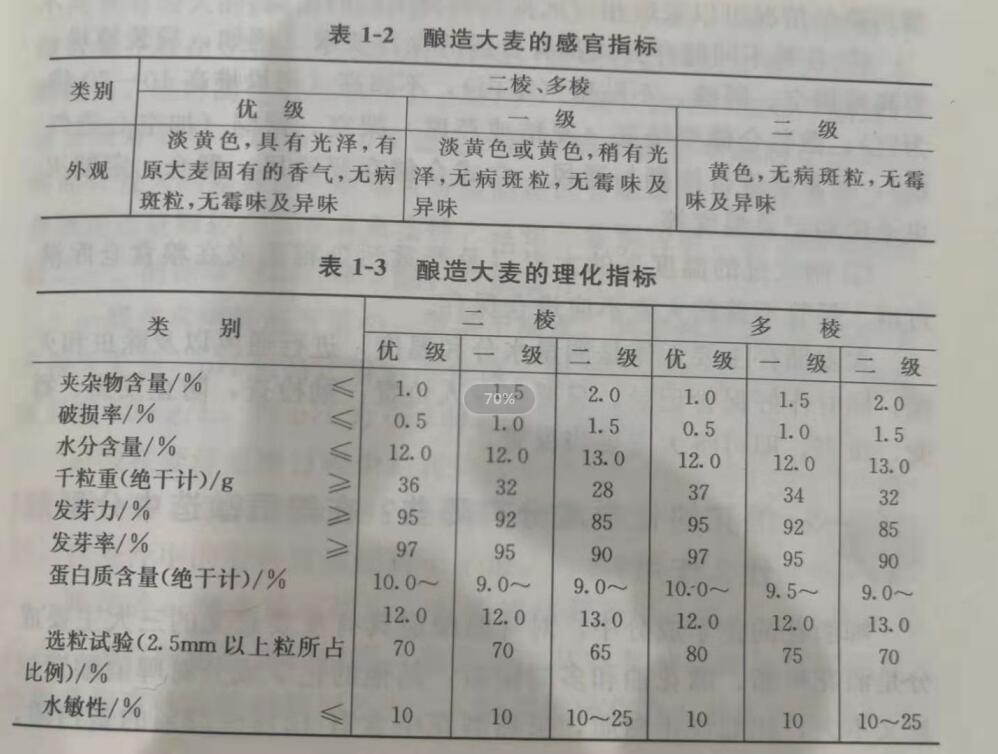 鑒別原料大麥的質量主要從外觀質量、物理檢驗和化學檢驗三個方面著手。其質量標準分為感官指標和理化指標兩大類,并依此將大麥分成三個等級(表1-2、表1-3)。
